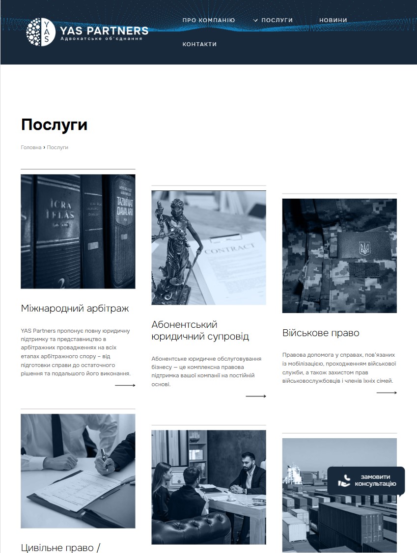 Сайт для Адвокатского объединения YAS Partners стал современной витриной юридической компании, которая подчеркивает экспертность команды адвокатов и делает взаимодействие с клиентами максимально удобным. Благодаря оптимизированной структуре и функциональности корпоративный веб-сайт обеспечивает быстрый доступ к юридическим услугам в Киеве, контактной информации и кейсам компании.