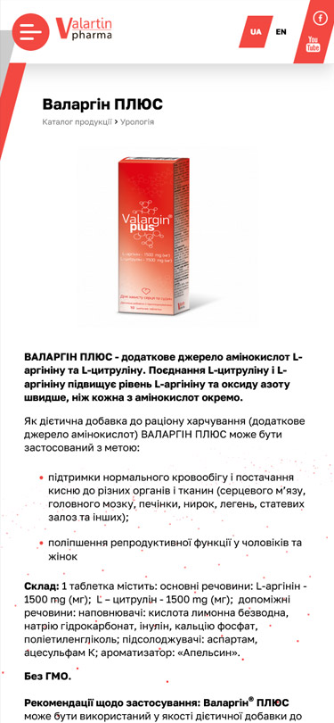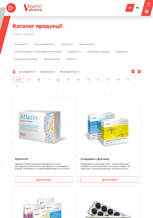 Сайт Valartin Pharma є мультиязичним (дві мови), що дозволяє ефективно взаємодіяти з українськими та міжнародними партнерами. Каталог продукції реалізовано з фільтрацією та сортуванням, що робить пошук необхідних ліків швидким та інтуїтивним.
